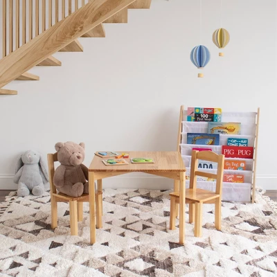 The set includes a square table and two chairs in a contemporary and versatile honey wood grain finish, sure to complement your home’s existing furniture whether it be in your toddler’s bedroom, playroom or the living room. This furniture set is easy to assemble with all hardware included. The sturdy table and chairs feature real wood material and solid wood legs legs for additional support and long-lasting durability.