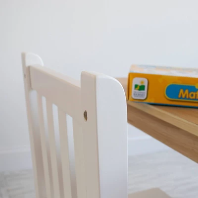 The set includes a square table in a contemporary and versatile natural wood grain finish and two white chairs, sure to complement your home’s existing furniture whether it be in your toddler’s bedroom, playroom or the living room.