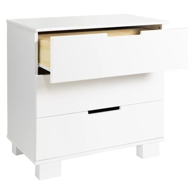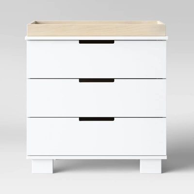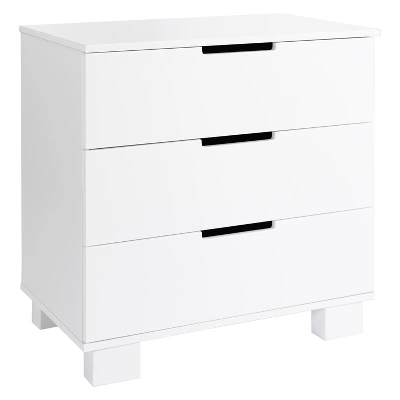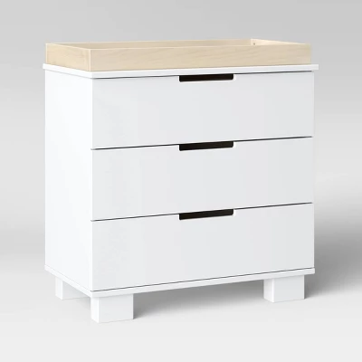 A changing table on top and a dresser just below, the modern Modo 3 Drawer Changer Dresser is a space-saving nursery necessity. Smart and stylish, the sleek design of the Modo 3 Drawer Changer Dresser provides ample drawer storage space. Up top, the changing tray’s raised sides help keep baby safe. Once baby has grown out of using the changer it can be removed to leave a chic dresser. The drawers smoothly and gently slide open thanks to metal glide hardware. Stop mechanisms on the drawers keep baby safe by ensuring drawers can’t be pulled all the way out. The changer dresser also includes an anti-tip kit to further enhance safety by attaching the dresser to the wall. The Modo 3 Drawer Changer Dresser matches the modern Harlow, Modo and Mercer convertible cribs, and the portable Origami Mini Crib.