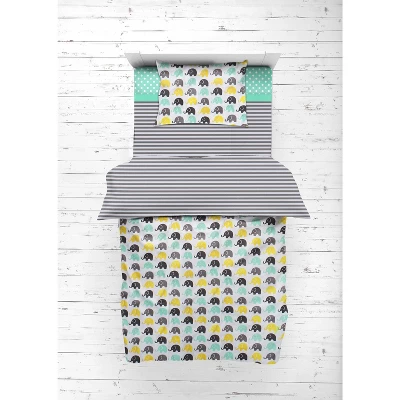 - This Bacati 4-piece Toddler Bedding Set Set Includes Reversible Oversize Comforter (42 x 55 inches), Toddler Bed Fitted Sheet(52 x 28 x 6 inches), Toddler Bed Flat Sheet(52 x 42 inches) which is fitted at the bottom to make the bed easily and Standard Pillow Case (20 x 25 inches) with french ties on the back in fun, colorful and signature prints in 100 percent cotton 200 Thread Count percale fabrics. Designed in United States by Experienced Designers. Many coordinating items available to purchase separately in this Bacati Elephants Mint Yellow Gray Bedding Collection.
