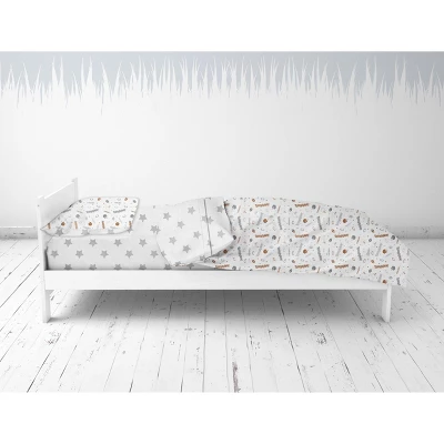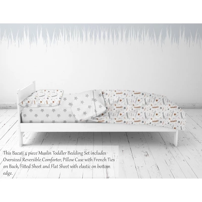 - This Bacati 4-piece Muslin Toddler Bedding Set Set Includes Reversible Oversize Comforter (42 x 55 inches), Toddler Bed Fitted Sheet(52 x 28 x 6 inches), Toddler Bed Flat Sheet(52 x 42 inches) which is fitted at the bottom to make the bed easily and Standard Pillow Case (20 x 25 inches) with french ties on the back in fun, colorful and signature prints in 100 percent cotton Muslin fabrics. Designed in United States by Experienced Designers. Many coordinating items available to purchase separately in this Bacati Muslin Bedding Collection.