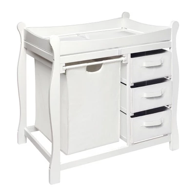 Badger Basket’s smart Sleigh Style Baby Changing Table with Hamper and 3 Baskets is an all-in-one station for changing and dressing your baby and keeping dirty clothes out of sight. Removable drawers and hamper so you can see everything inside and easily tote Baby’s soiled duds to the laundry room.