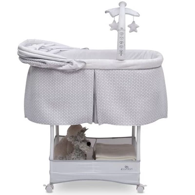 Help ease your baby to sleep with the automatic gliding motion, soothing sounds, spinning star toys, twinkling lights and soft-glow nightlight on the Serta iComfort Auto Gliding Bassinet. Activate the bassinet’s whisper-quiet gliding motion with a push of a button-the smooth sway creates a serene sleep space. The modern gray and white pattern on plush fabrics will be at home anywhere, from the nursery to the family room and the parents’ bedroom. Locking wheels, a light blocking canopy and memory foam mattress pad means your newborn can sleep by your side, no matter where you are in the house. Plus, the removable fitted sheet is machine washable for easy care. Brought to you by Serta, the leader in mattress innovation and technology, this bassinet will make it easier than ever for baby to fall asleep and stay asleep throughout the night. This bassinet is recommended for babies 0-5 months. Stop use at 5 months or once your infant begins to push up on their hands and knees, whichever comes first. Use the included AC Adapter for battery free operation.