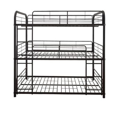 The ultimate space saver for small rooms, the Cairo triple metal bunk bed will be the best additional for your sweet home. Stacking three beds securely, the easy access guardrails keep your kids snug and secure, while the two built-in ladders offer easy access. This bunk bed is available in both twin and full size in a smooth sandy black finish.