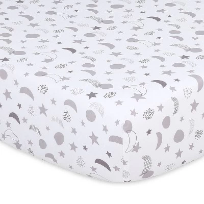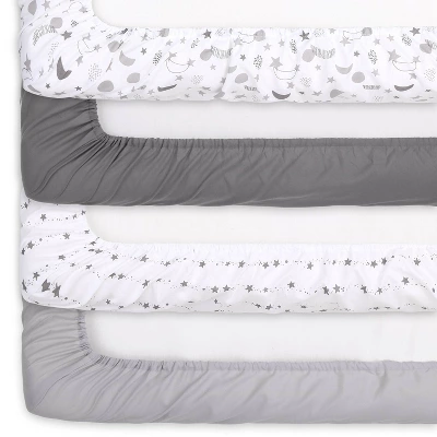 Get ready to dream of the outer limits of cuteness with this 4pk crib sheet set. Set of four makes for quick and easy changes, with simple machine wash/tumble. Set features one sheet with planets, moons and stars across a wonderous solar system in tones of Gray and is paired with a second sheet of trailing stars and stardust, both on a crisp white grounds. The light and medium Gray solid sheets are the great compliment. Perfect for any little baby boy or baby girl.