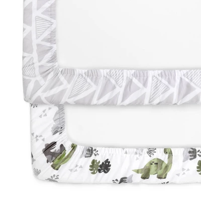 Dinos roam the land in the Dino 2 Pack Playard Sheet set from The Peanutshell. One sheet features dinosaurs in camo in shades of green with a fun background of tossed leaves and geometric shapes on crisp white; the second sheet features a fun geometric print in gray on white. Each sheet is made of soft microfiber – smooth against baby’s delicate skin. All-around elastic for easy fit . With a 2 pack, you always have an extra sheet on hand for quick changes with machine wash/tumble dry easy care. Perfect to send your little one off to sleep!