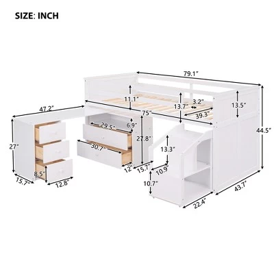 - [Versatility Galore] There is an independent movable desk under the bed. The desk has five drawers that can be pulled out and an open shelf. The drawers can hold odds and ends, and the shelf can hold books, practicality very strong, meet the needs of your learning.